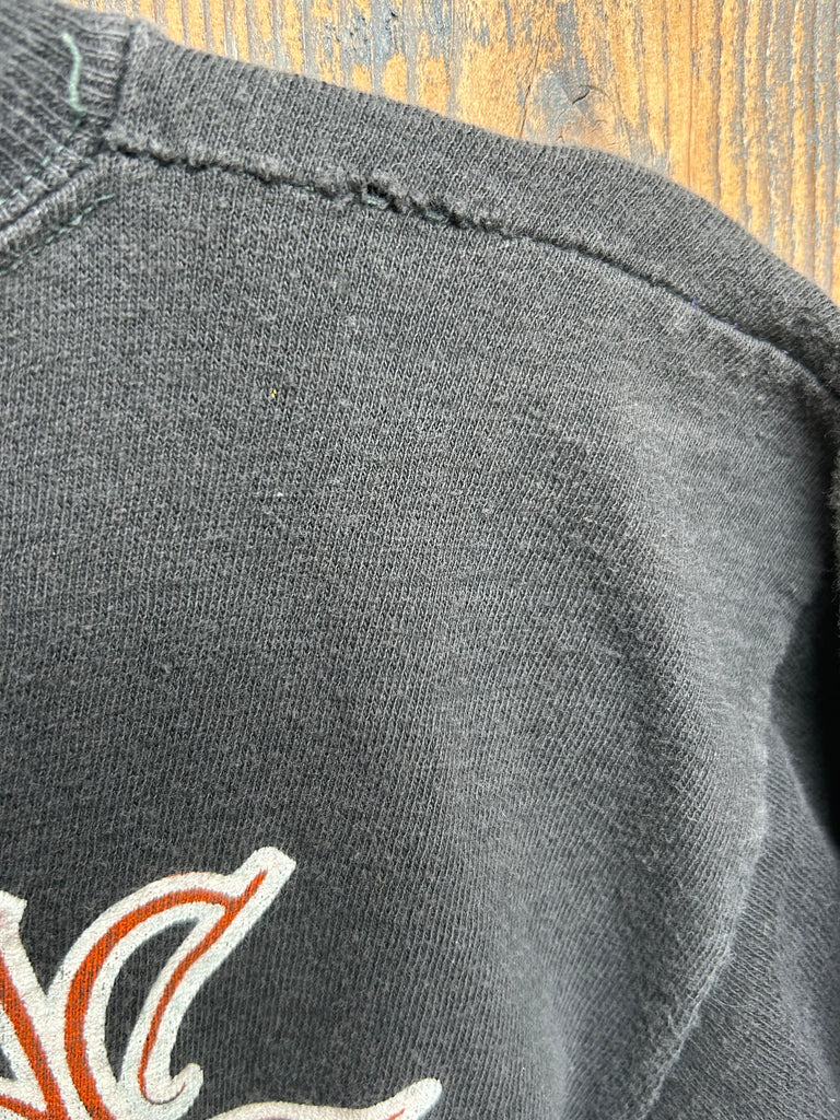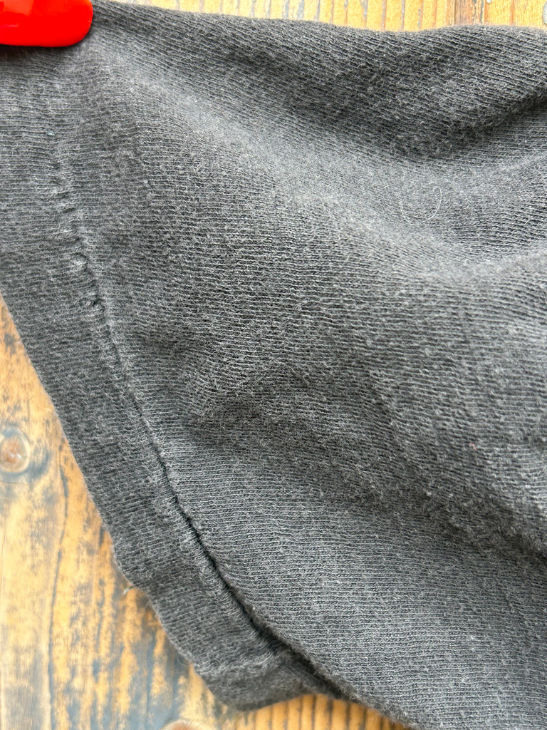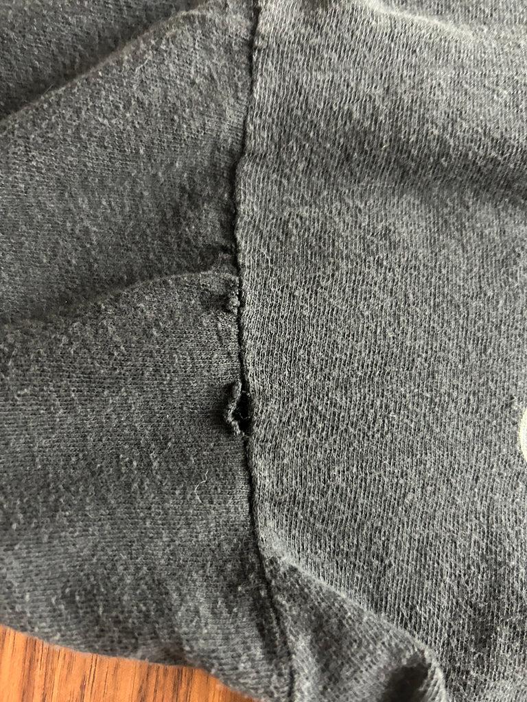 Single stitch sleeves and hem. Some minor stitching flaws, see photos. One hole in armpit. Lightweight and has some stretch.